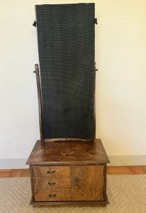 「鏡立て」は柄のついた丸い鏡(円鏡)を立てかけて使うための木でできた道具のことです。